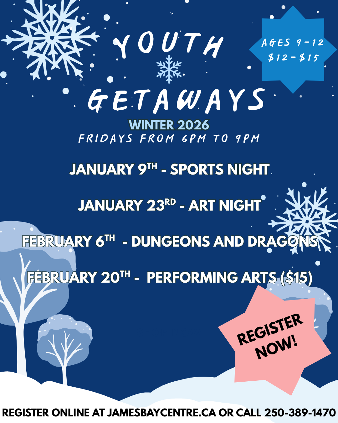 We have a ton of great activities lined up for our Youth Getaways program this winter. Youth Getaways is for youth ages 9-12, and runs Fridays from 6-9PM.