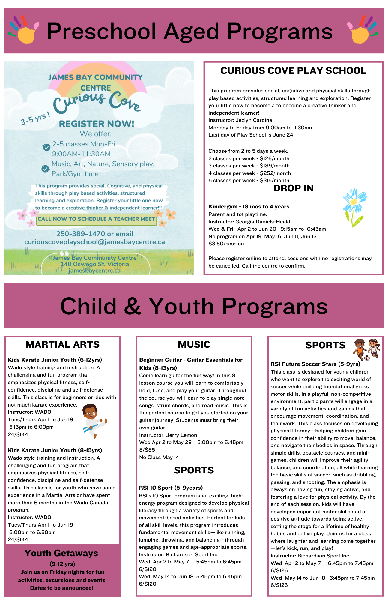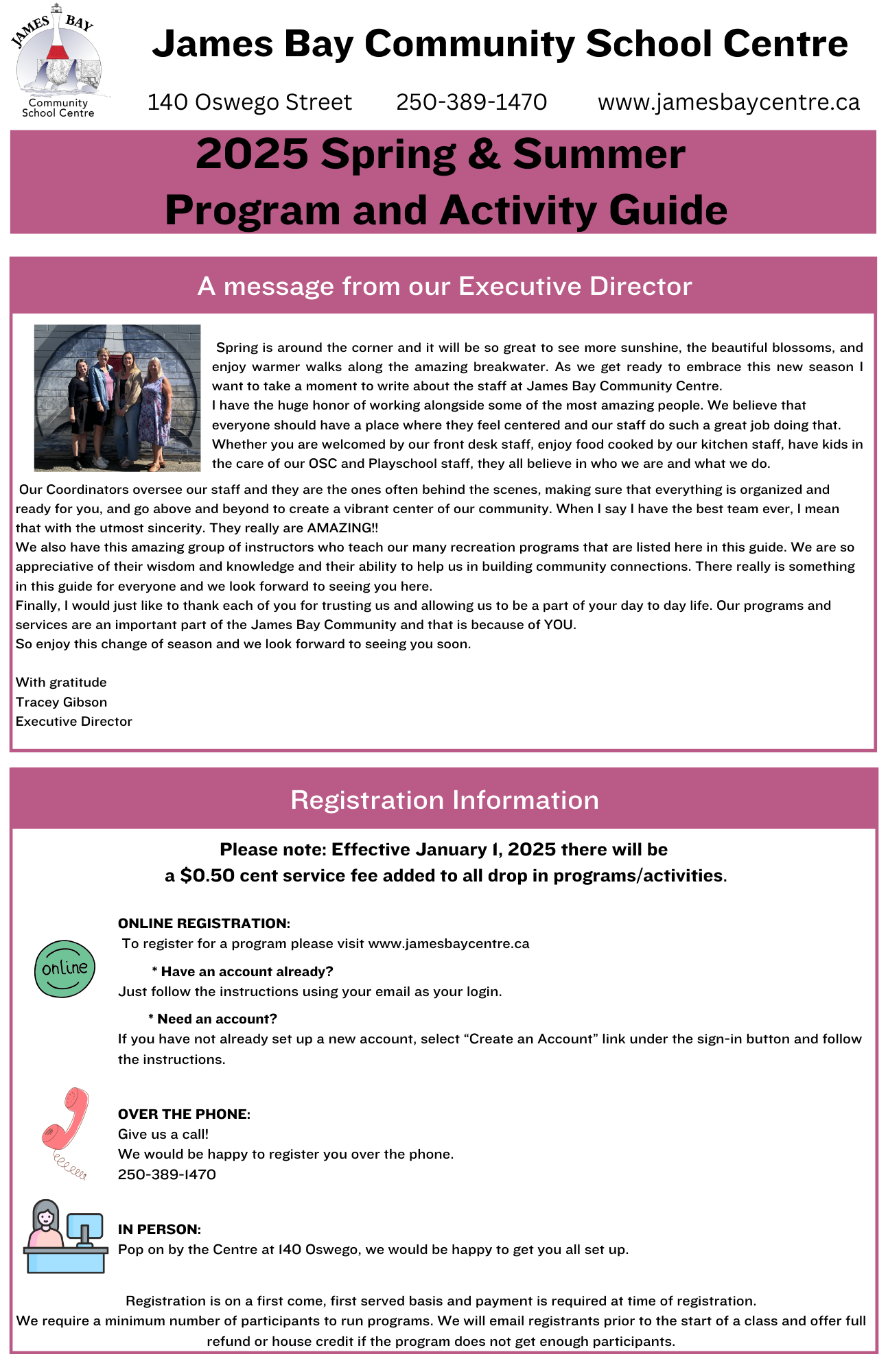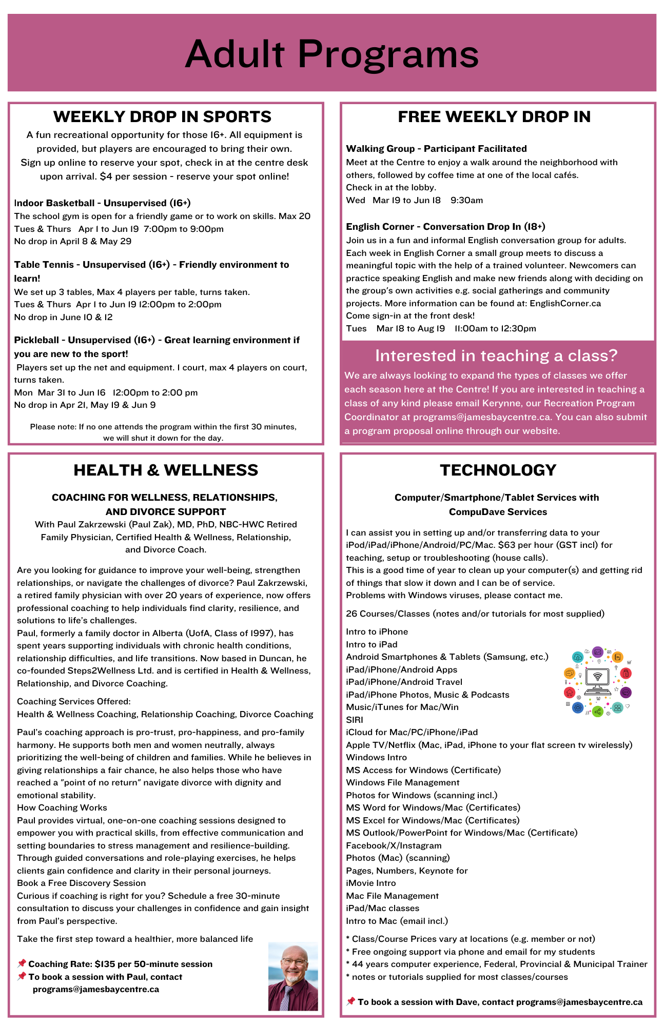You can register for classes over the phone, at the Centre desk, or online!
