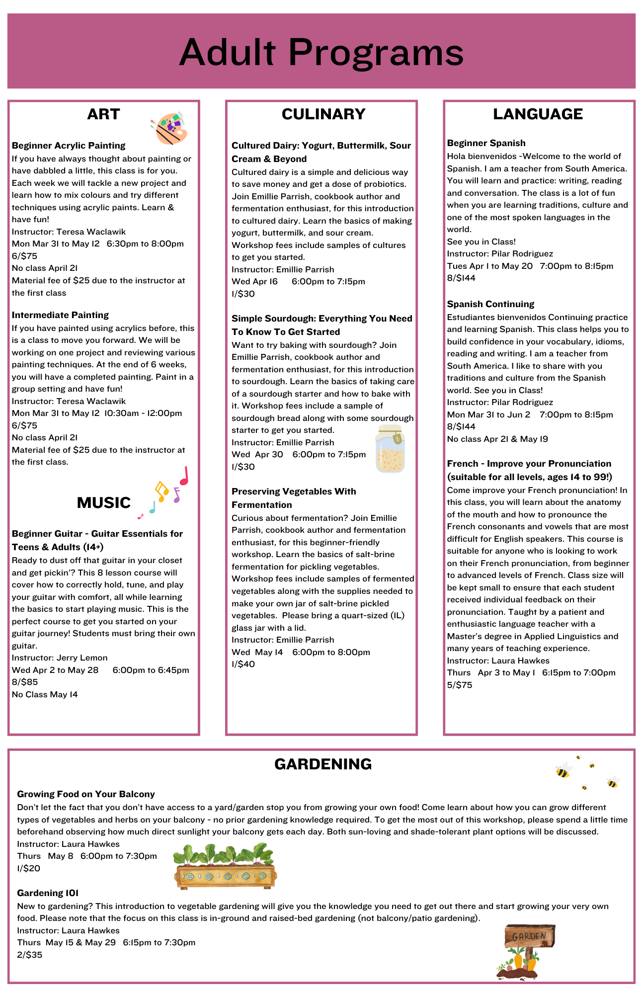 We are always interested in offering new programs! If you have a suggestion or want to teach a program or workshop, please visit our Recreation Program Proposal page.